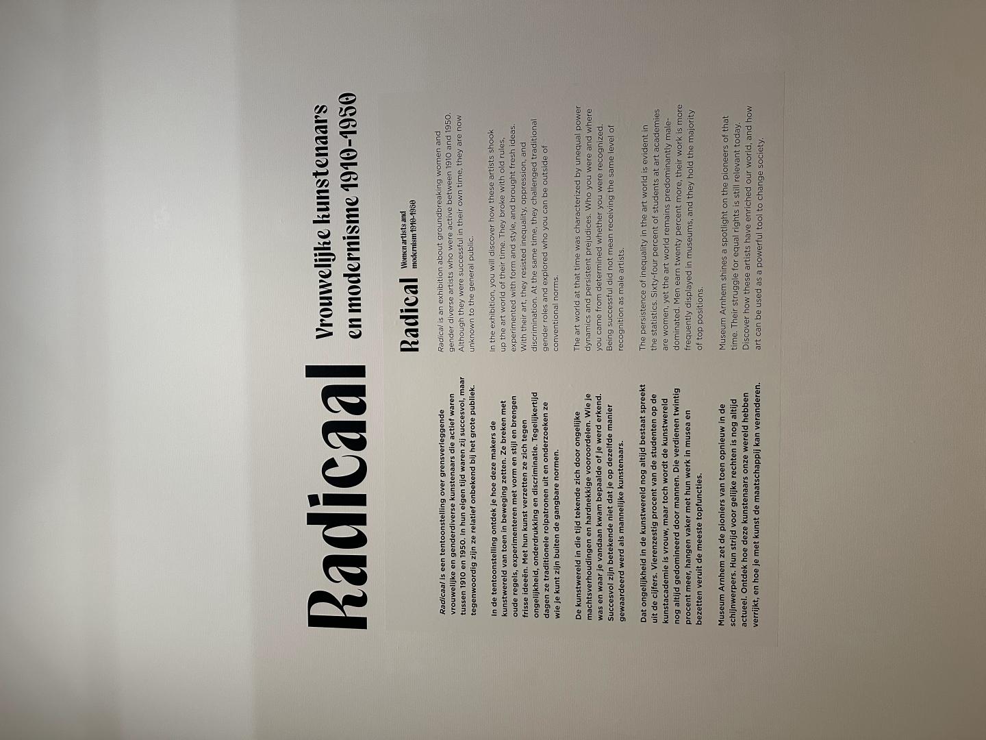 From September 2025 to January 2026, I had the great honor collaborating with Museum Arnhem as one of the curators of a special segment within the major exhibition **Radicaal – Vrouwelijke kunstenaars en modernisme 1910-1950 (“Radical – Women Artists and Modernism 1910-1950”)*. This landmark exhibition celebrated the work and impact of more than sixty female artists from over 20 countries whose contributions expanded and redefined modernism in the early twentieth century, challenging gender hierarchies in art history.